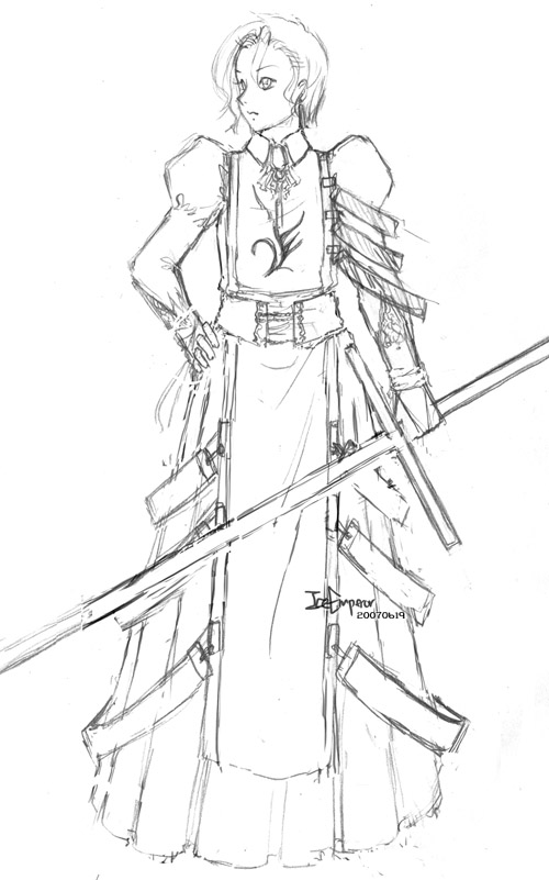 1994년 당시 생각했었던 여성 + 드레스 + 대검 컨셉의 캐릭터 시절을 리디자인한 것입니다. 1994년 당시 초기 설정 복장은 에메랄드 드래곤의 탐린 복장 변형에 가까웠죠. 지금도 서코트 등에서 그런 모습이 많이 남아있지만..